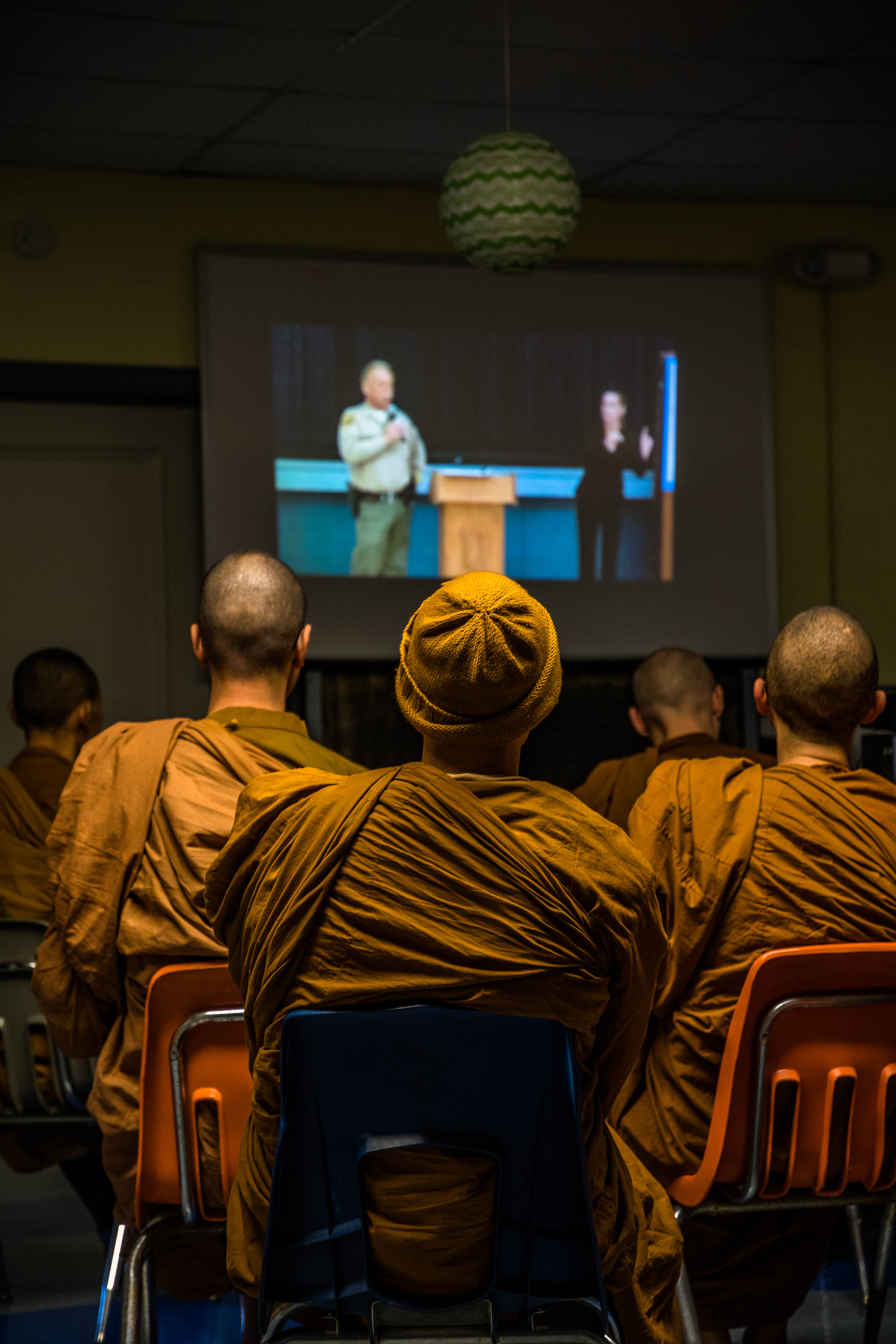 Watching the Sheriff's Briefing, and Saturday night Dhamma talk. (2017 Fire)