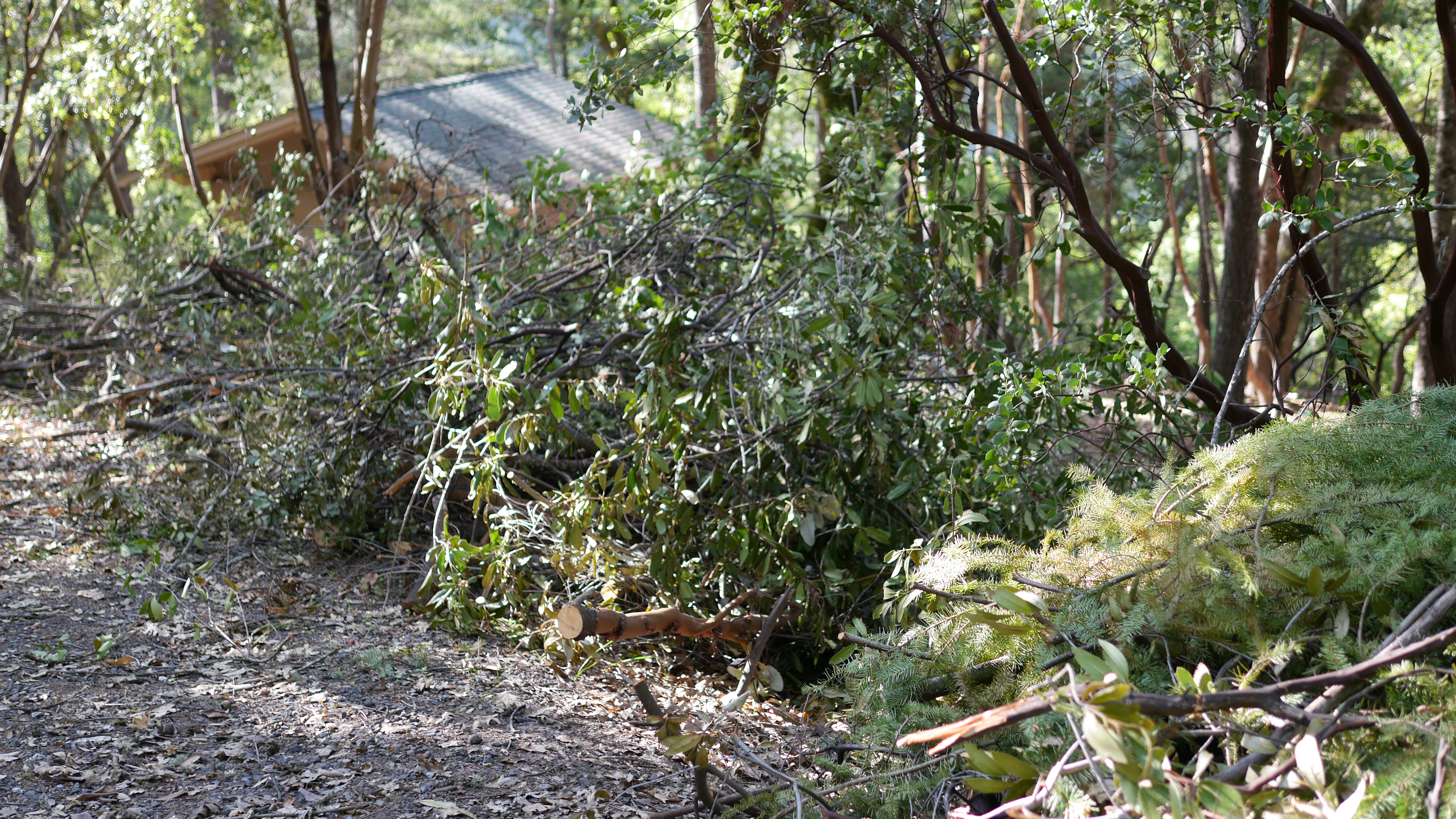 Brush accumulated where the trail meets the road