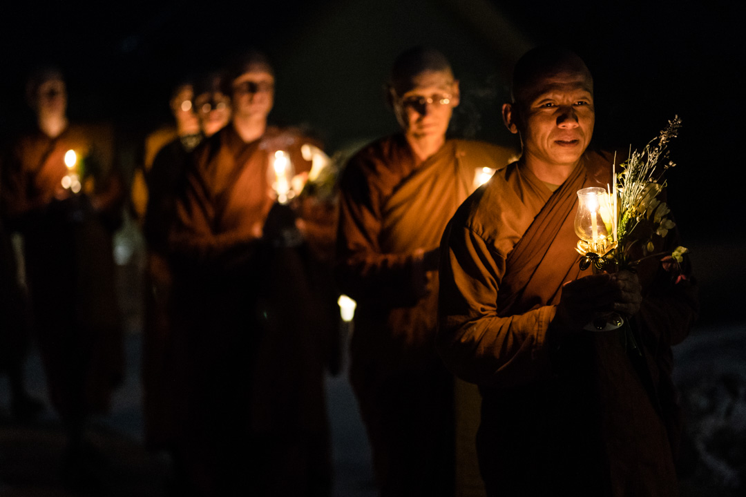 Ajahn Sek leads the monks as they circumambulate the Buddha on Māgha Pūjā.