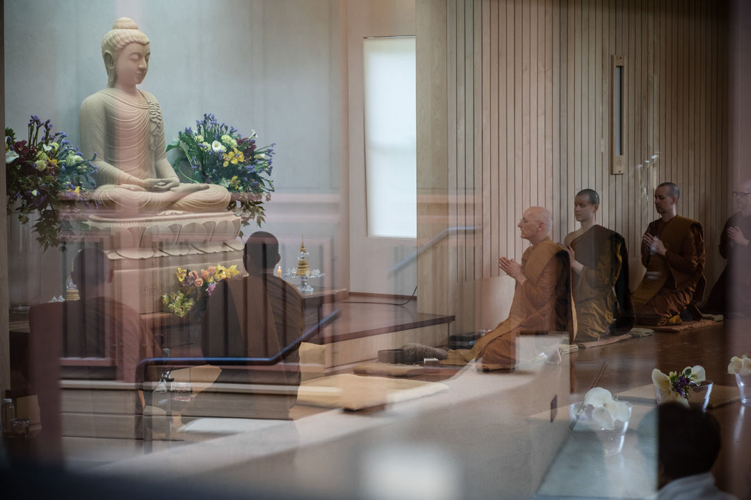 Seen from outside the meditation hall, monks chant to the Buddha image.