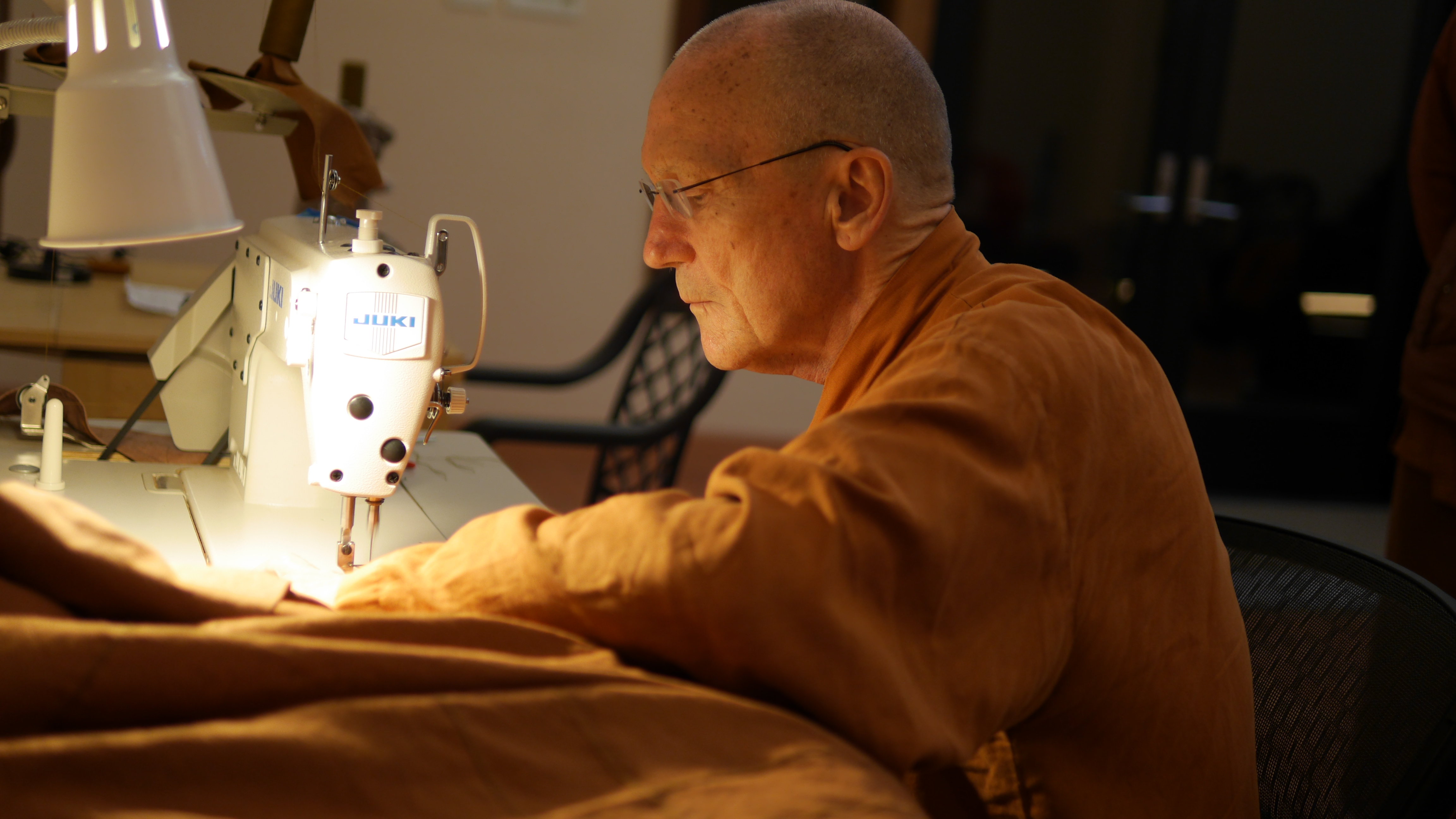 Luang Por Pasanno sewing on the boarder of the Kathina robe