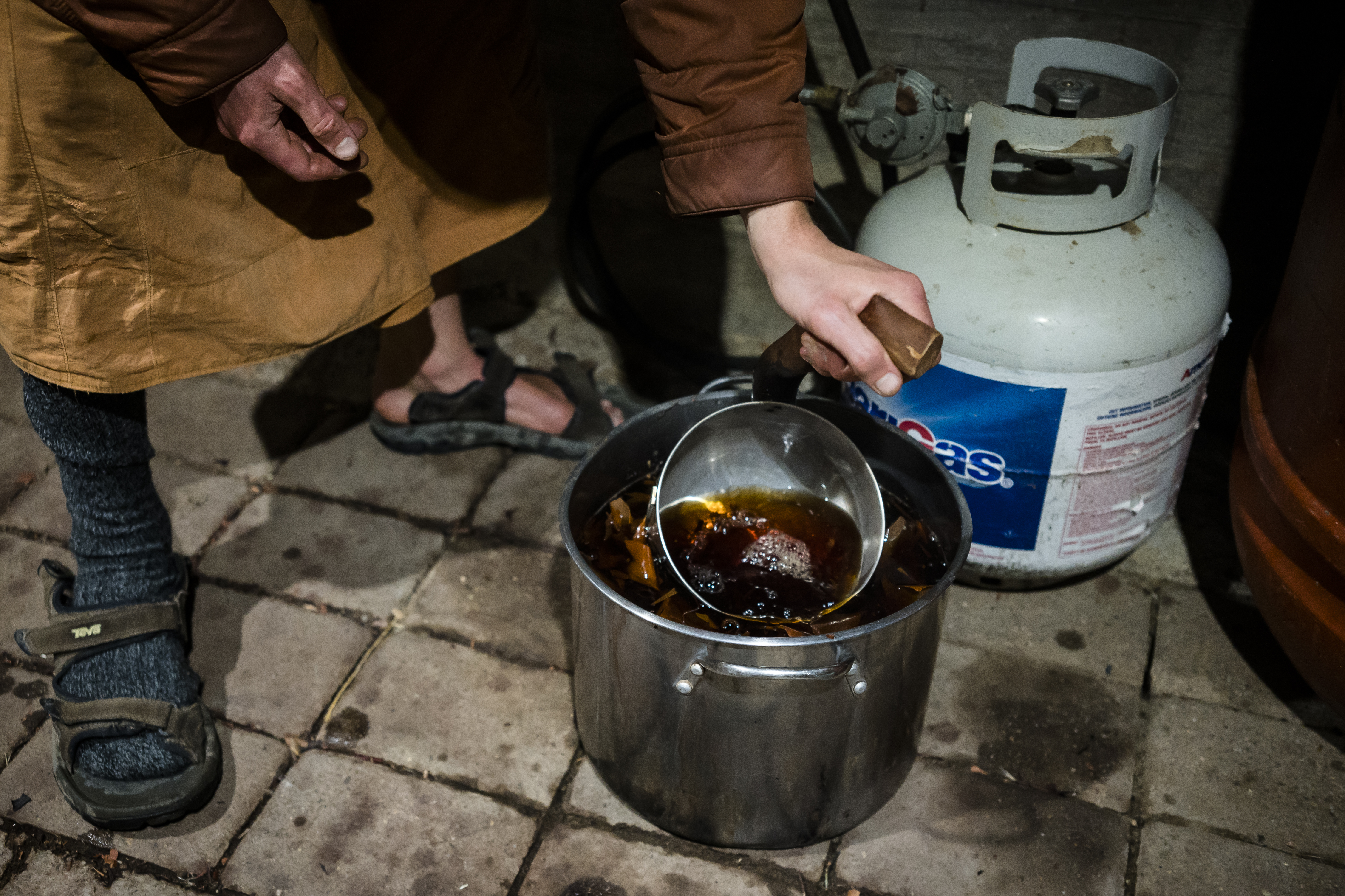 Dhammavavro separates madrone bark from the initial, weak dye solution before moving it to the reduction bath.